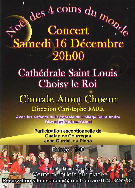 La chorale Atout Chœur, sous la direction de Christophe Faré, donnera un concert le samedi 16 décembre à la cathédrale de Choisy le Roi à 20h00. Elle sera accompagnée de la chorale des enfants de l’école Saint André, dirigée par Oriane Orinel. Ce sera l’occasion de voyager un peu sur le thème de « Noël des 4 coins du Monde », avec un répertoire joyeux et rythmé, où le public sera sollicité sur des chants fredonnés depuis la plus tendre enfance !